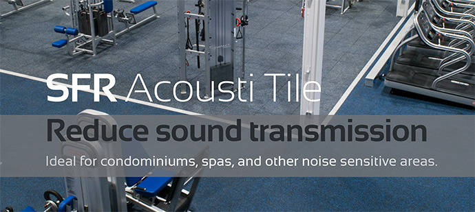 Available in 24 standard colors, SFR Acousti Tile colors coordinate with fitness equipment as well as other flooring options. This product is recommended for High Rise Condominiums, CrossFit Centers, Olympic Platforms, Colleges and Universities, with free weight areas. They are easier and faster to install than traditional glue down floors because no adhesive is needed. Plus, its unique Quadbloks rod fastening system gives you the ability to quicly move or replace tiles as needed.